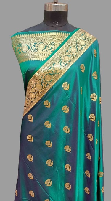 Banarasi Mashru satin silk sarees with a soft satin feel. Drapes beautifully for a graceful silhouette.Offered in versatile colours for bridal and occasion wear