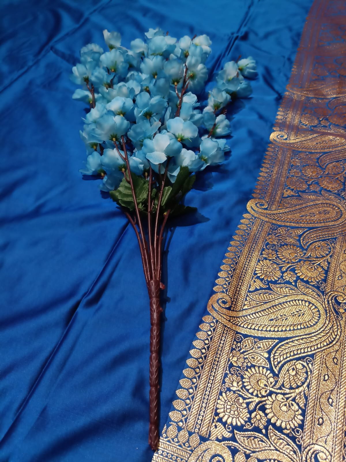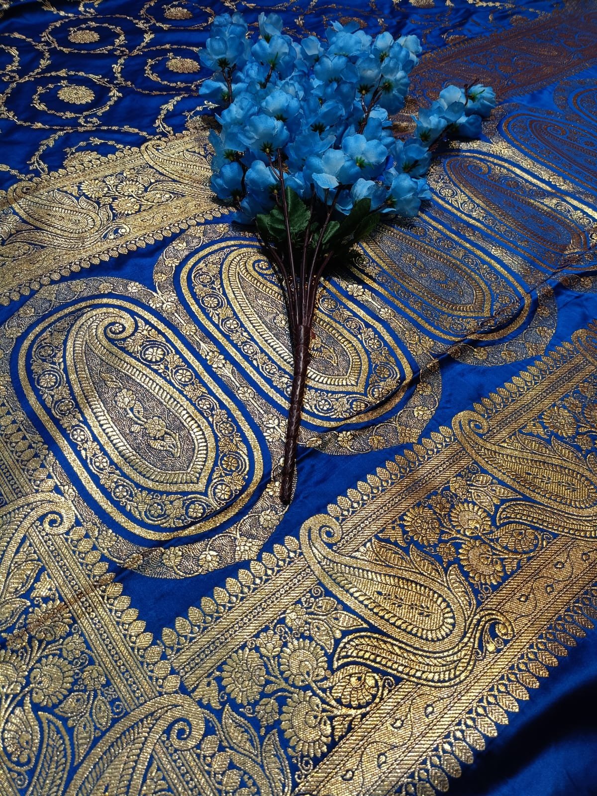 Crafted from premium Mashru Satin, this royal blue saree features a luxurious high-sheen finish and a smooth, fluid drape. The body is adorned with an elegant Zari ring traditional design, featuring intricate circular floral motifs, and is framed by a broad, classic Banarasi Zari border and pallu. Measuring a standard 5.50 meters in length, this opulent saree comes complete with a matching blouse piece, making it a stunning choice for weddings and grand festivities.