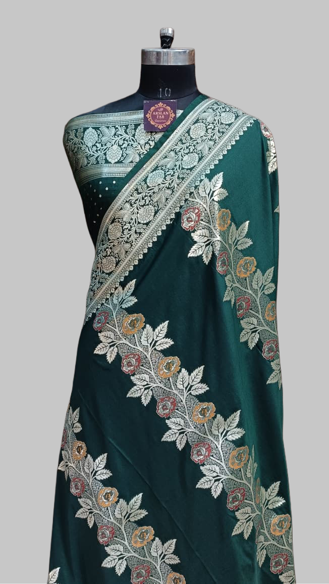 This vibrant Bottle Green Semi-Satin Silk saree is a testament to traditional Banarasi saree artistry, featuring an elegant cross-floral zari design woven throughout the body. Each motif is meticulously detailed with multi-color meena work, creating a refined and colorful contrast against the rich green fabric. Completed with a sophisticated zari border and a heavy designer pallu, this saree measures a standard 5.50 meters in length and includes a matching blouse piece for a regal, festive look.