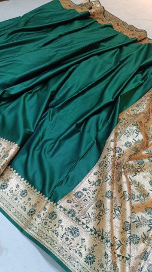 Bottle Green Mashru Satan Silk Zari Border Pallu Plain Saree