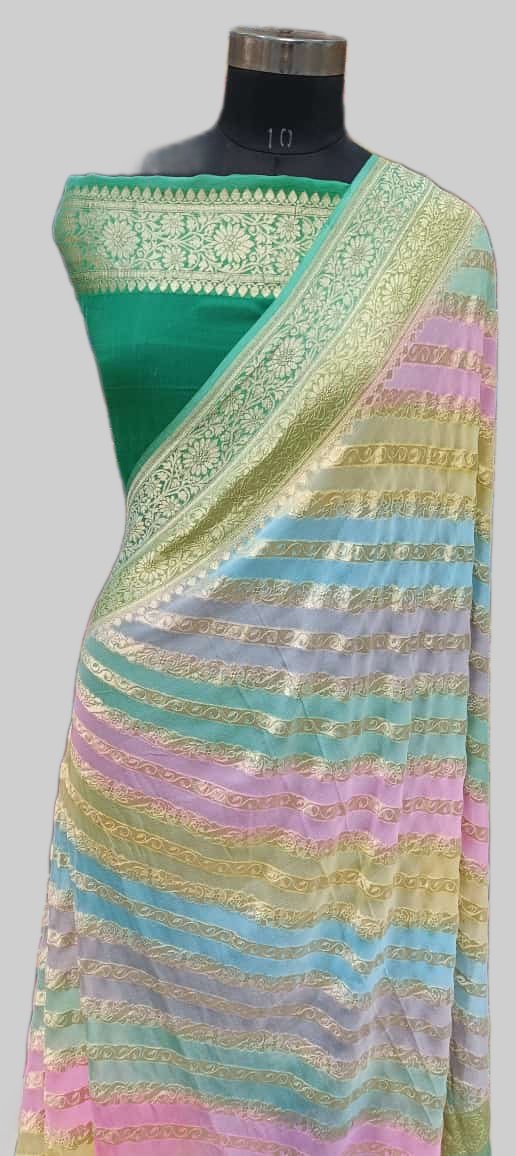 Emerald Georgette Zari Border Stripe Multicolour Saree