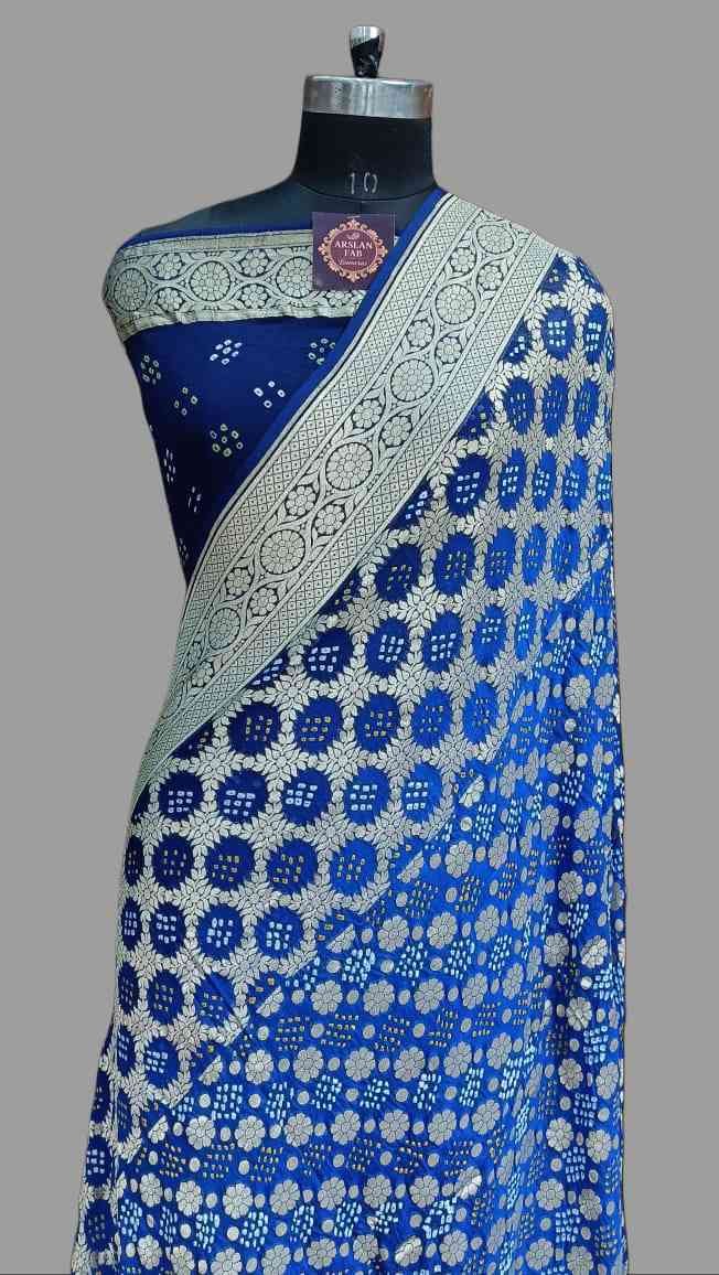 This sophisticated german blue Pure Georgette Banarasi saree beautifully combines traditional artistry with contemporary charm. It features an intricate gold Zari jaal design overlaid with classic Bandhani tie-dye patterns, creating a rich, textured appearance. The look is completed by a broad floral Zari border and pallu, offering a graceful drape in a standard 5.50-meter length with an included matching blouse piece.