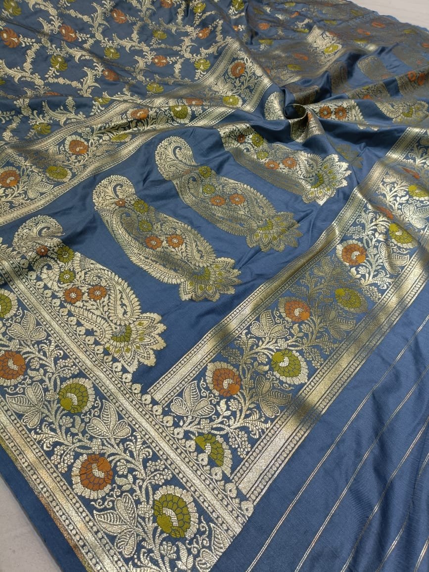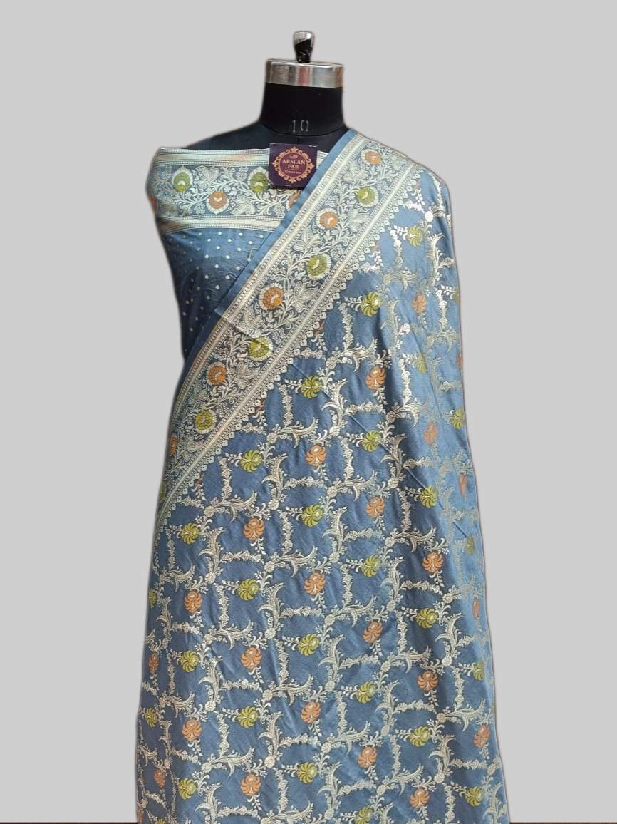 This Dark Grey Semi-Satin saree combines a soft, contemporary hue with opulent Banarasi saree artistry. The body is adorned with an intricate all-over Meenadar jaal design, featuring delicate floral patterns woven with colorful silk threads for a vibrant finish. It is framed by a traditional Zari border and a rich designer pallu, offering a standard 5.50-meter length and an included matching blouse piece for a regal and sophisticated ensemble. Ideal for festive occasions.
