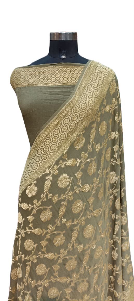 This luxurious kahi grey Pure Georgette saree features an exquisite all-over Neem Zari jaal design that offers a sophisticated, matte-gold finish. The drape is elegantly framed by a detailed floral border and a rich designer pallu, making it a lightweight yet royal choice for weddings and high-end festivities. Saree length 2.50 mt. plus blouse.