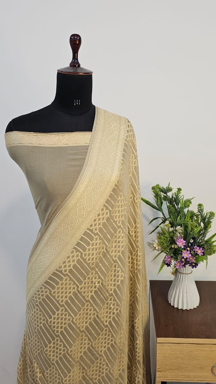 Kahi Grey Pure Georgette Banarasi Zari Border Pallu Jaal Design