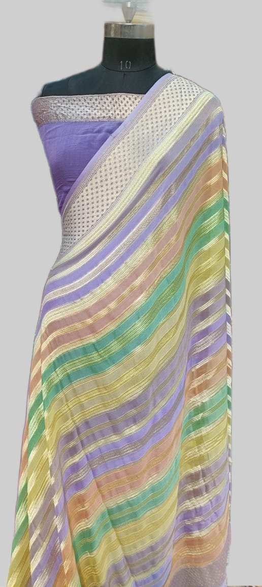 This vibrant Pure Georgette saree features a refreshing multi-color striped design in soft pastel shades of mint green, purple,yellow and baby pink. The saree is elegantly highlighted by an intricate gold Zari border and pallu, offering a standard 5.50-meter length with a matching blouse piece for a full and graceful look.