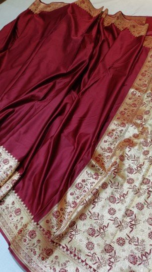 Maroon Mashru Satan Silk Zari Border Pallu Plain Saree