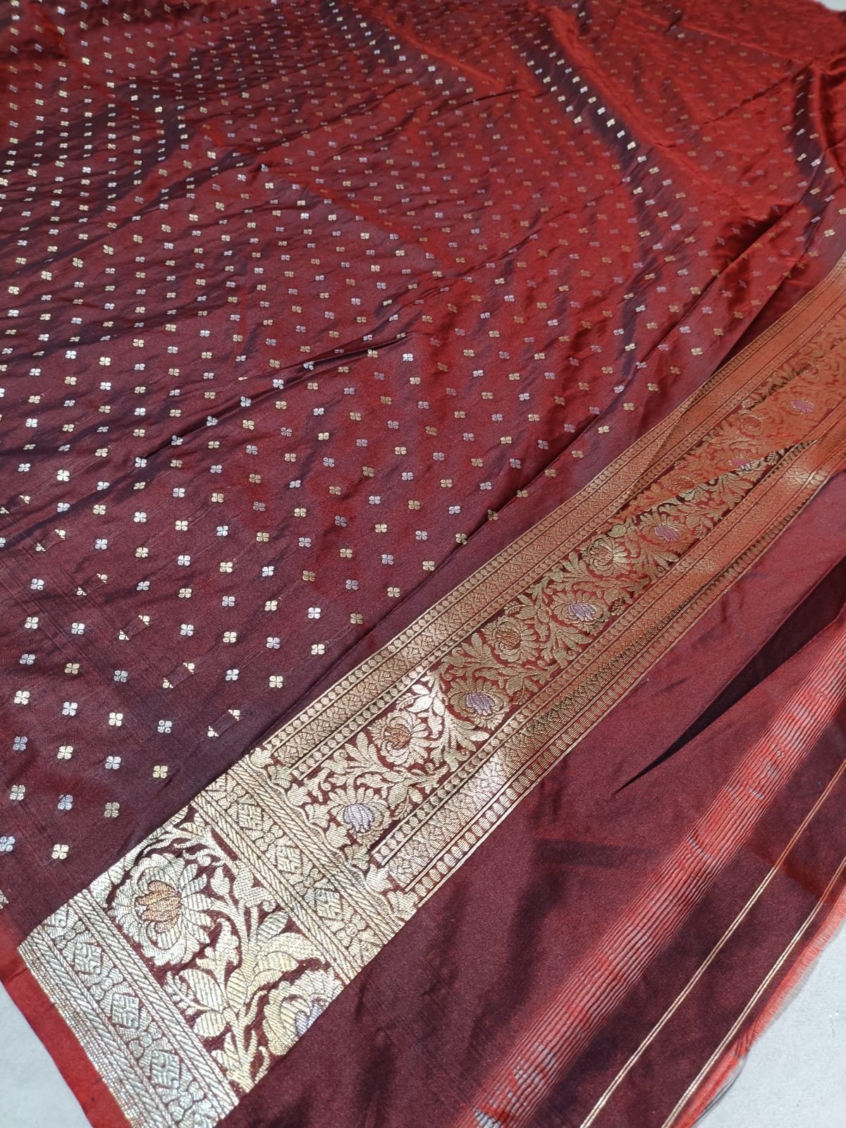 Indulge in luxurious allure with this Maroon Semi-Silk Satin saree, boasting a high-sheen finish and smooth, elegant drape that captivates every gaze. Expertly detailed with a sophisticated Meenadar zari border and pallu, it weaves traditional Banarasi artistry into the vibrant fabric—floral motifs and shimmering threads evoking Varanasi’s timeless mastery. Measuring a standard 5.50 meters, it includes a matching 0.80-meter blouse piece for seamless coordination. Perfect for festive celebrations and weddings, this regal ensemble promises sophistication and grace for Silk Supreme’s cherished customers.