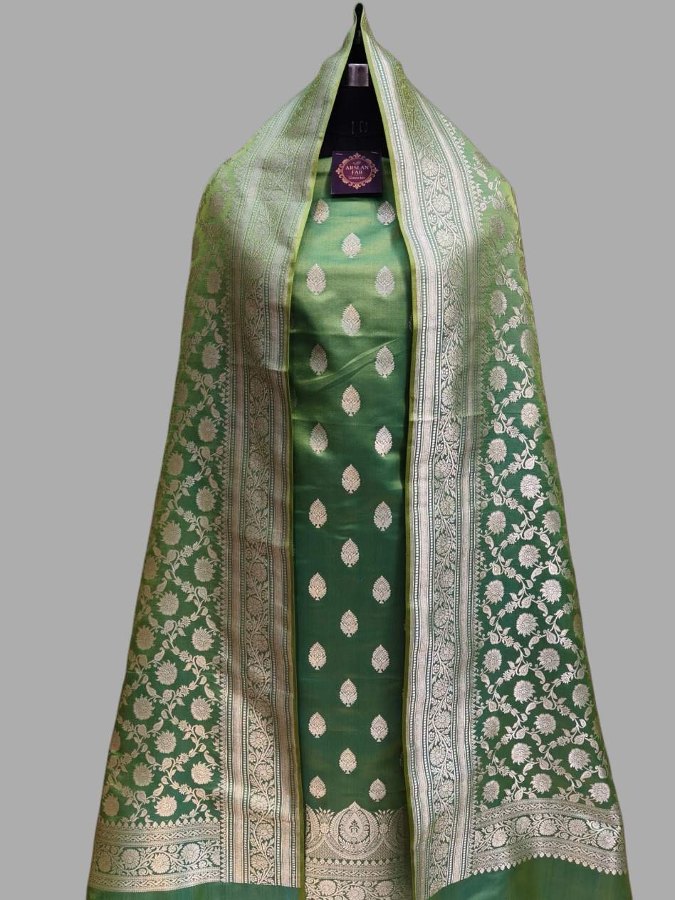 This Mehdi Mashru Satin Salwar Suit is a magnificent 3-piece ensemble that perfectly captures the regal essence of Banarasi handloom artistry. The unstitched top is elegantly adorned with delicate gold zari butis, while the highlight of the set is the breathtaking heavy jaal design dupatta, featuring an intricate web of floral patterns and a signature zari border. Crafted from premium Mashru satin for a luxurious high-sheen finish and paired with a simple plain bottom, this suit is a sophisticated choice for weddings, grand festivals, and bridal celebrations.