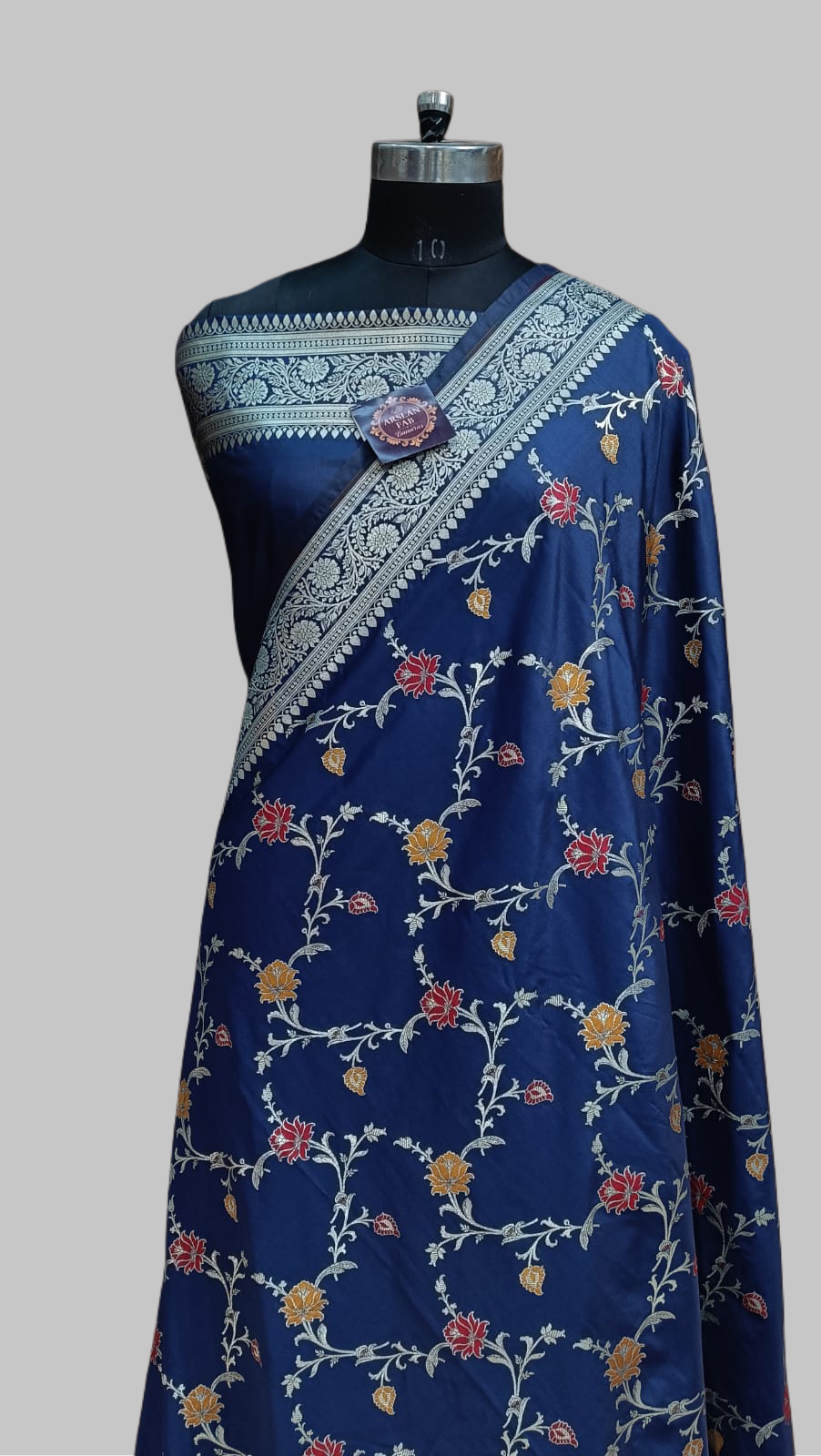 This vibrant Navy Blue Semi-Satin Silk saree is a masterpiece of traditional Banarasi saree artistry, featuring an intricate all-over Jaaldar zari design across the body. The exquisite pattern is further enhanced with multi-color Meena work, adding a refined touch of detail to the rich red fabric. Completed with a sophisticated zari border and a heavy designer pallu, this saree measures a standard 5.50 meters in length and includes a matching blouse piece for a regal, festive look.