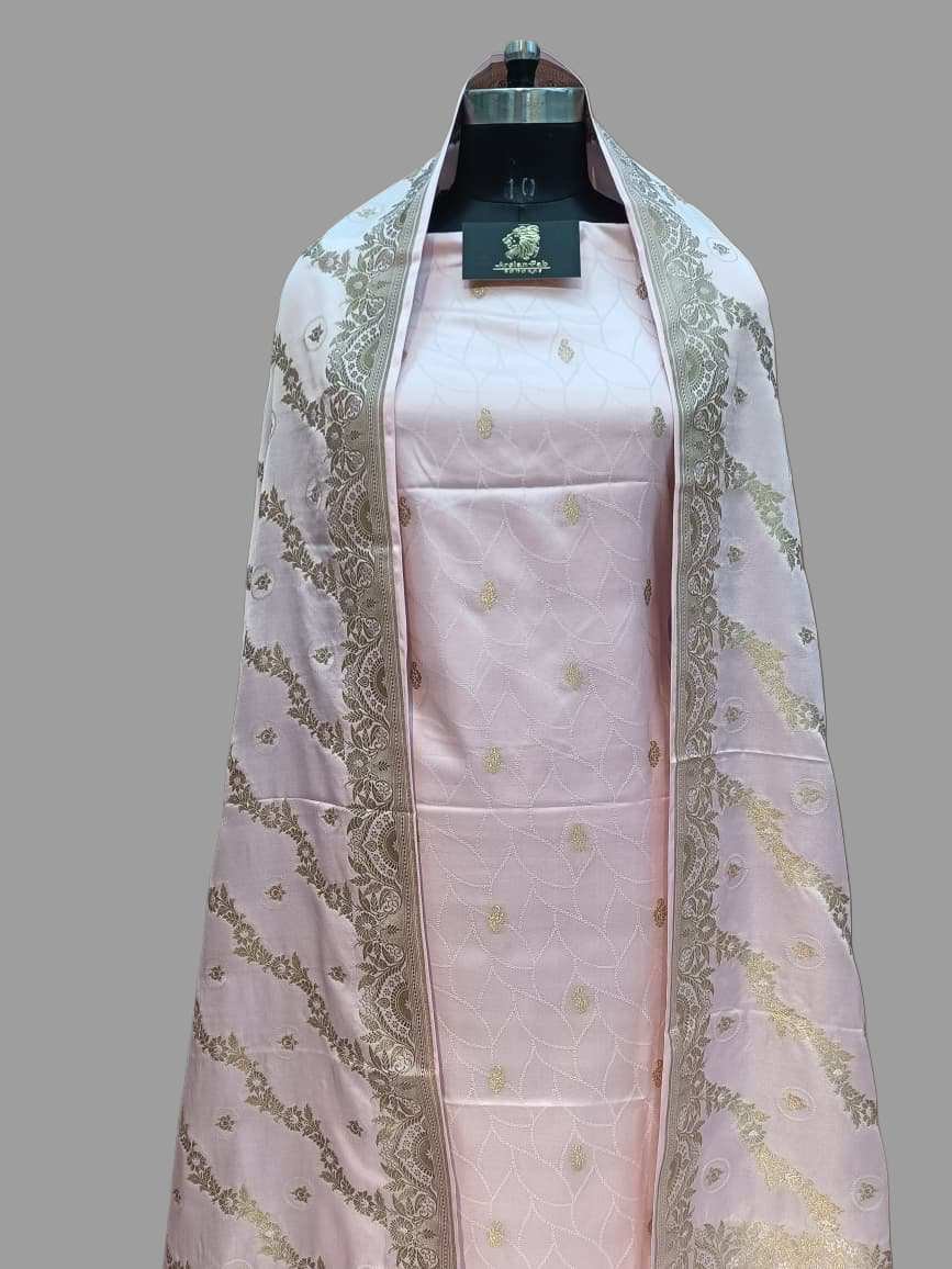 This elegant pastel pink 3-piece Banarasi semi-silk salwar suit set features a rich, high-sheen finish and traditional craftsmanship. The ensemble includes a beautifully woven shirt (kameez) adorned with delicate zari butis or intricate meenadar motifs, a matching bottom, and a coordinated dupatta featuring a signature Banarasi zari border. Designed for both comfort and a royal aesthetic, this unstitched set is a perfect choice for weddings, festive gatherings, and formal celebrations.