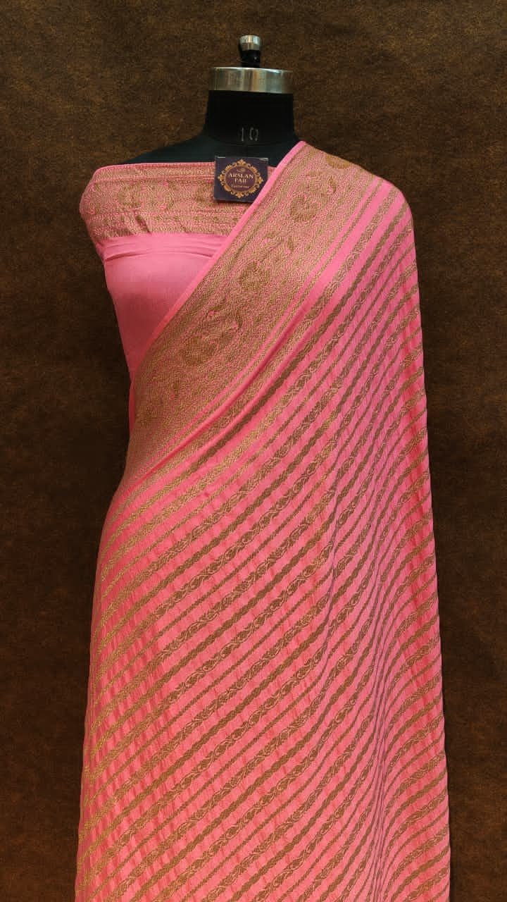 Crafted from high-quality Pure Georgette Banarasi Saree, this elegant saree features a modern designed zari stripe body that offers a sophisticated and fluid drape. The ensemble is beautifully highlighted by an intricate Zari border and a decorative pallu, blending contemporary style with traditional Banarasi craftsmanship. Measuring a standard 5.50 meters in length, it comes complete with a matching blouse piece.