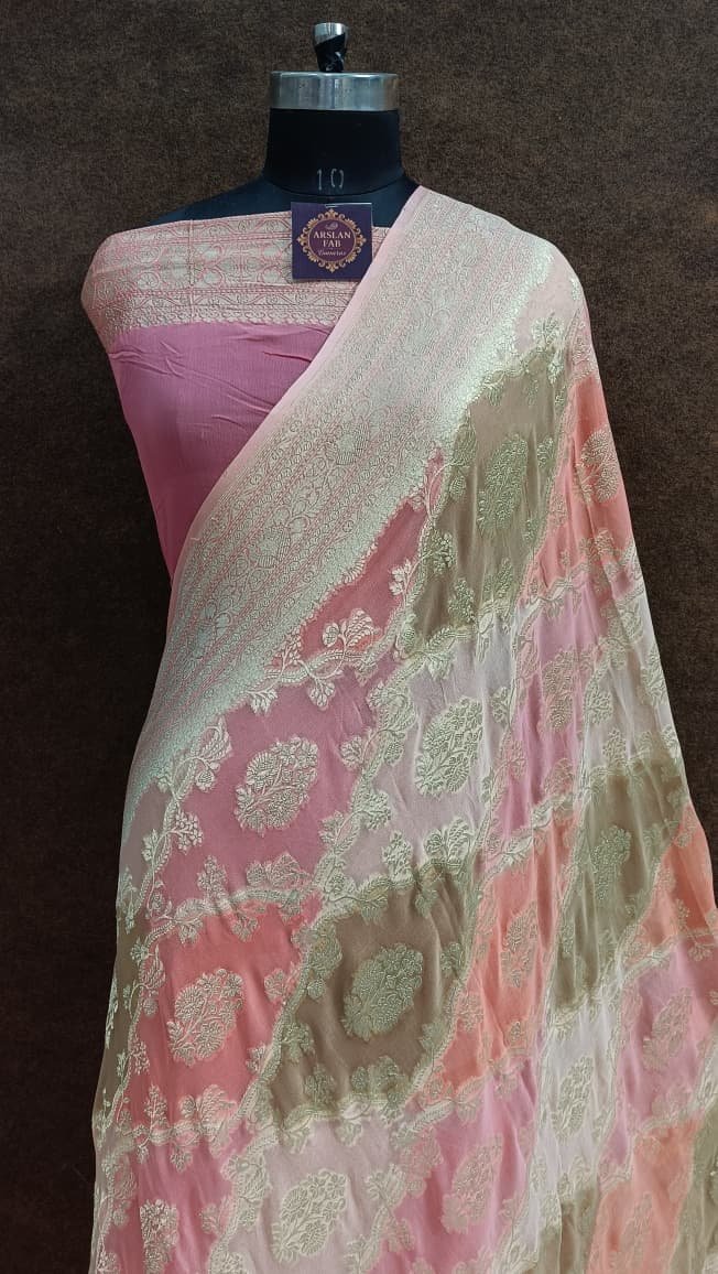 Crafted from high-quality Pure Georgette Banarasi Saree, this elegant saree features a modern designed jalldar multi dyed body that offers a sophisticated and fluid drape. The ensemble is beautifully highlighted by an intricate Zari border and a decorative pallu, blending contemporary style with traditional Banarasi craftsmanship. Measuring a standard 5.50 meters in length, it comes complete with a matching blouse piece for a perfectly coordinated look.