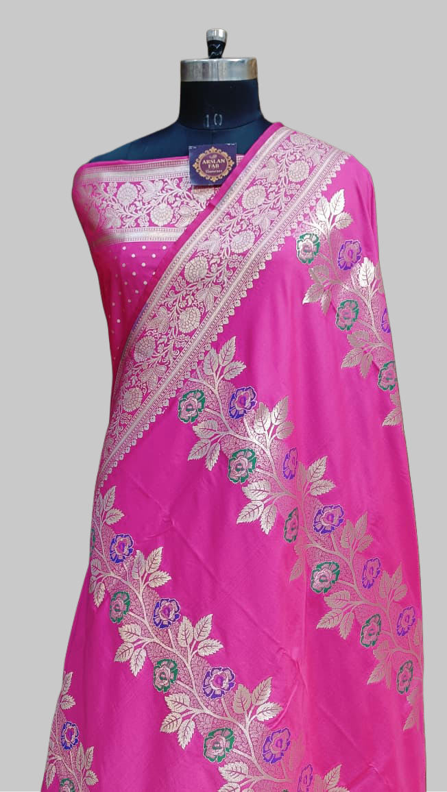 This vibrant Pink Semi-Satin Silk saree is a testament to traditional Banarasi artistry, featuring an elegant cross-floral zari design woven throughout the body. Each motif is meticulously detailed with multi-color meena work, creating a refined and colorful contrast against the rich pink fabric. Completed with a sophisticated zari border and a heavy designer pallu, this saree measures a standard 5.50 meters in length and includes a matching blouse piece for a regal, festive look.