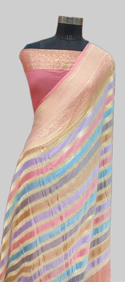 This vibrant Pure Georgette saree features a refreshing multi-color striped design in soft pastel shades of levander, sky blue, and baby pink. The saree is elegantly highlighted by an intricate gold Zari border and pallu, offering a standard 5.50-meter length with a matching blouse piece for a superb look.