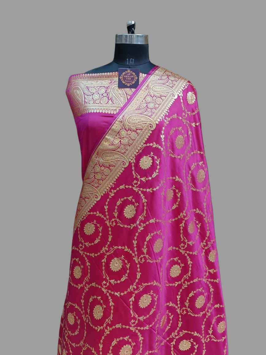 Crafted from premium Mashru Satin, this rani pink saree features a luxurious high-sheen finish and a smooth, fluid drape. The body is adorned with an elegant Zari ring traditional design, featuring intricate circular floral motifs, and is framed by a broad, classic Banarasi Zari border and pallu. Measuring a standard 5.50 meters in length, this opulent saree comes complete with a matching blouse piece, making it a stunning choice for weddings and grand festivities.