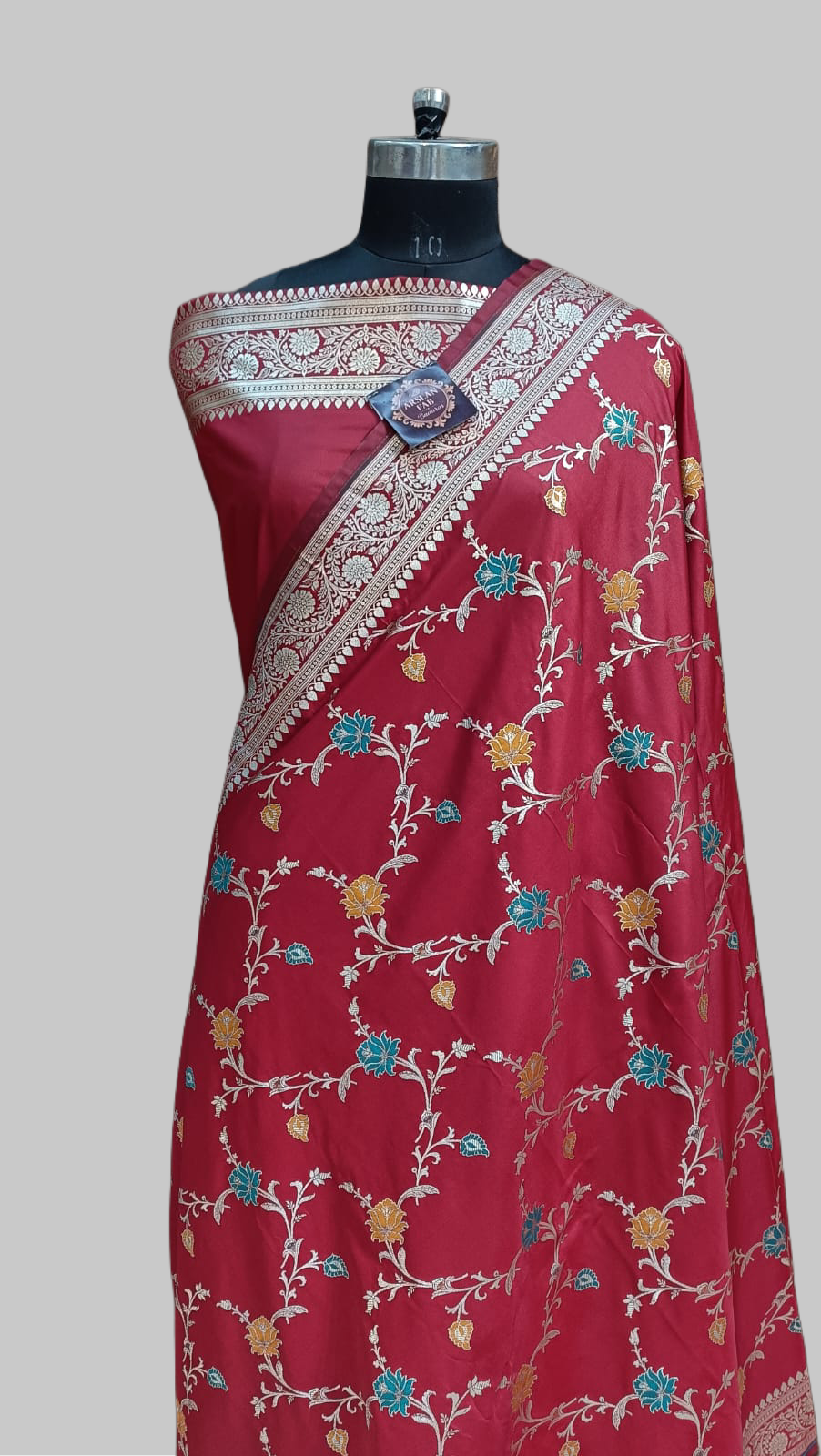 Red Semi Satan Silk Zari Border Pallu jaal Multi Meena Saree