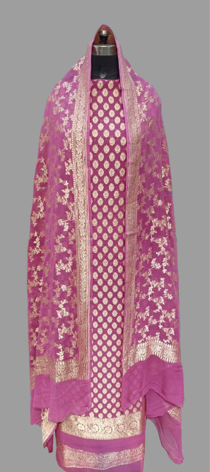Strawberry Banarasi Georgette Salwar Suit Set with All-Over Zari Motifs