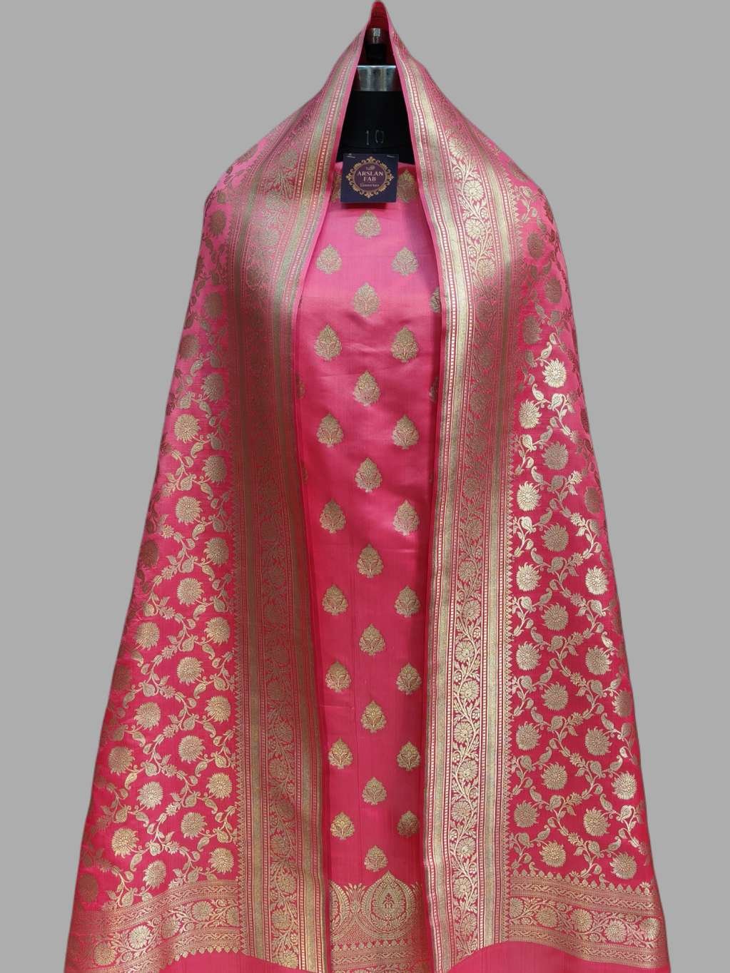 This Strawberry Mashru Satin Salwar Suit is a magnificent 3-piece ensemble that perfectly captures the regal essence of Banarasi handloom artistry. The unstitched top is elegantly adorned with delicate gold zari butis, while the highlight of the set is the breathtaking heavy jaal design dupatta, featuring an intricate web of floral patterns and a signature zari border. Crafted from premium Mashru satin for a luxurious high-sheen finish and paired with a simple plain bottom, this suit is a sophisticated choice for weddings, grand festivals, and bridal celebrations.